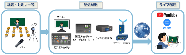 | ・配信を希望する対象 ・既存の映像・映像機器 ・通信環境 ・スケジュール ・ご予算 | ・配信するシステムの提案 ・機器選定 ・システム構築 ・配信用手続き ・配信用設定 ・通信回線手続き |